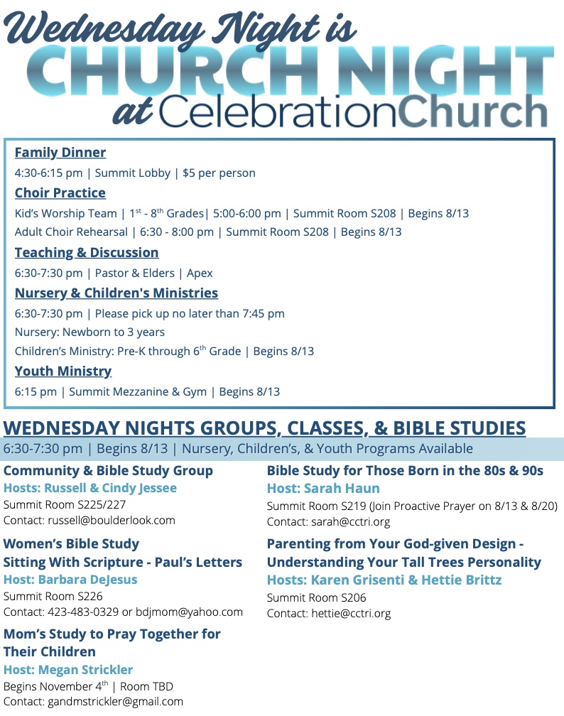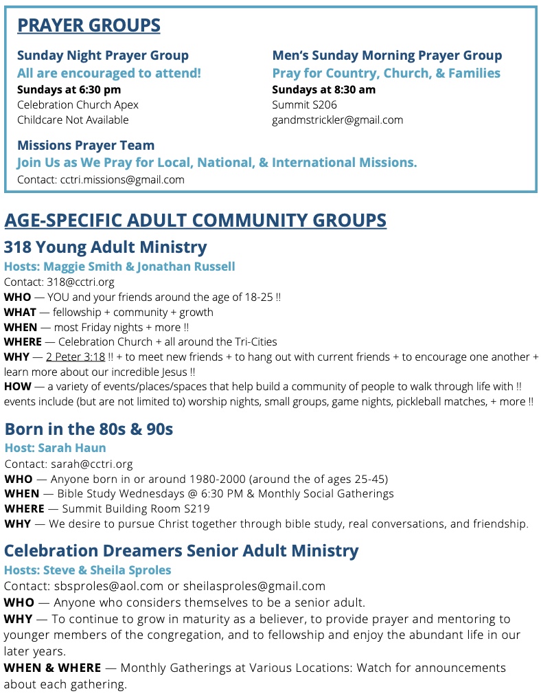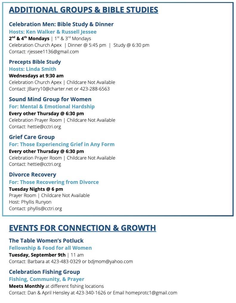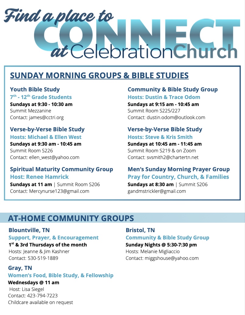 A maturing believer is someone who is continuing to grow in three distinct relationships: intimacy with God, community with believers, and discipleship to nonbelievers. The hope is that the Christ in me will unite with the Christ in you and that the Christ in us will draw us together to touch the world. There are many avenues to accomplish this goal. Beginning with Celebration Connect, our mission is to help establish your belonging in the loving Body of Christ. Discipleship classes will equip and encourage your calling to the Great Commission of Jesus Christ. Community Groups provide a safe environment for friendship and accountability. Community Groups include but are not limited to Home Groups, Growth Groups, Bible Studies, Online Groups, Prayer Groups, Mentoring, Watch-Parties, Special Interest Groups, and Service Groups. For more information, contact Sarah Haun at sarah@cctri.org or 423.747.1550.